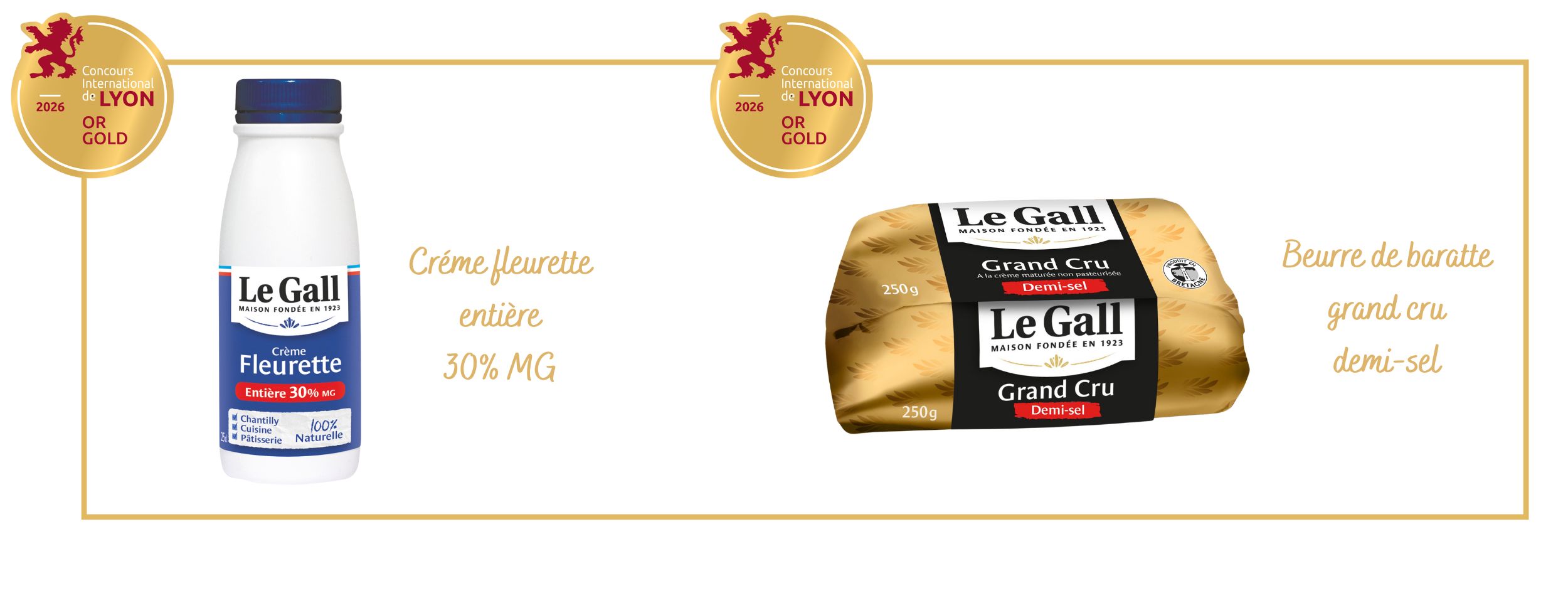 Pour cette édition 2026, Maison Le Gall se voit remettre 5 médailles : l’or pour le Grand Cru demi-sel, le beurre de baratte doux et la crème fleurette et l’argent pour le Grand Cru cristaux de sel et le beurre de baratte demi-sel.