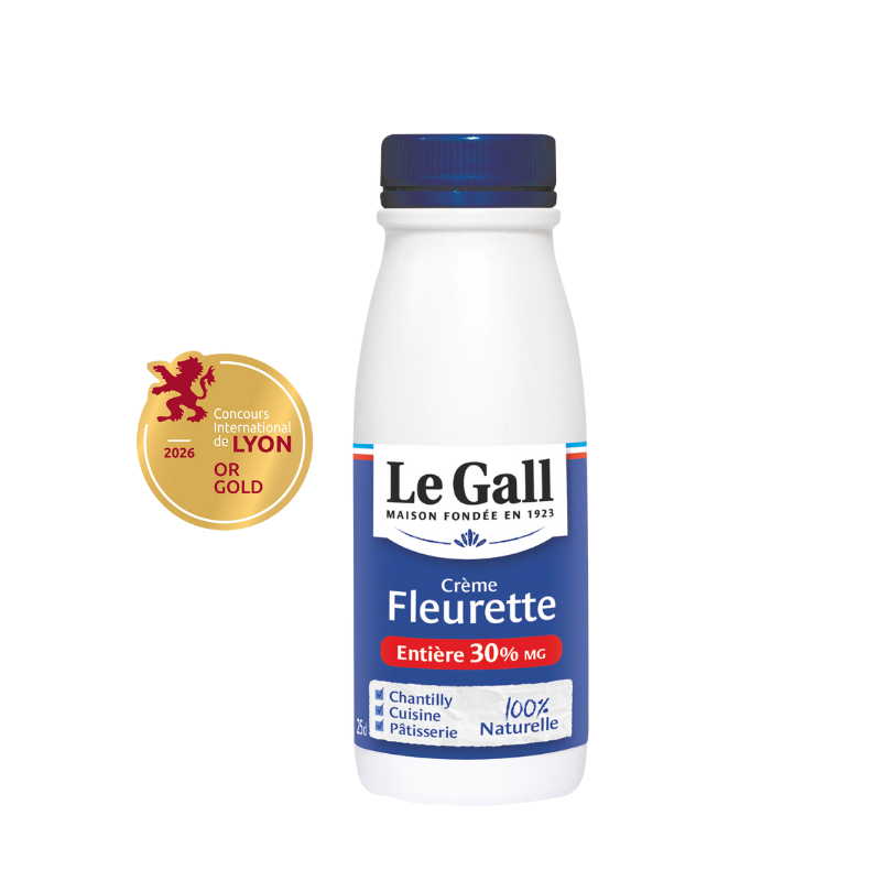 La crème fraîche fleurette LE GALL est particulièrement appréciée et reconnue pour ses saveurs particulières et ses qualités techniques en cuisine. Sa fabrication bien spécifique apporte un compromis entre les crèmes épaisses et liquides. Onctueuse et délicate au goût, est elle 100% naturelle, sans conservateur ni émulsifiant.